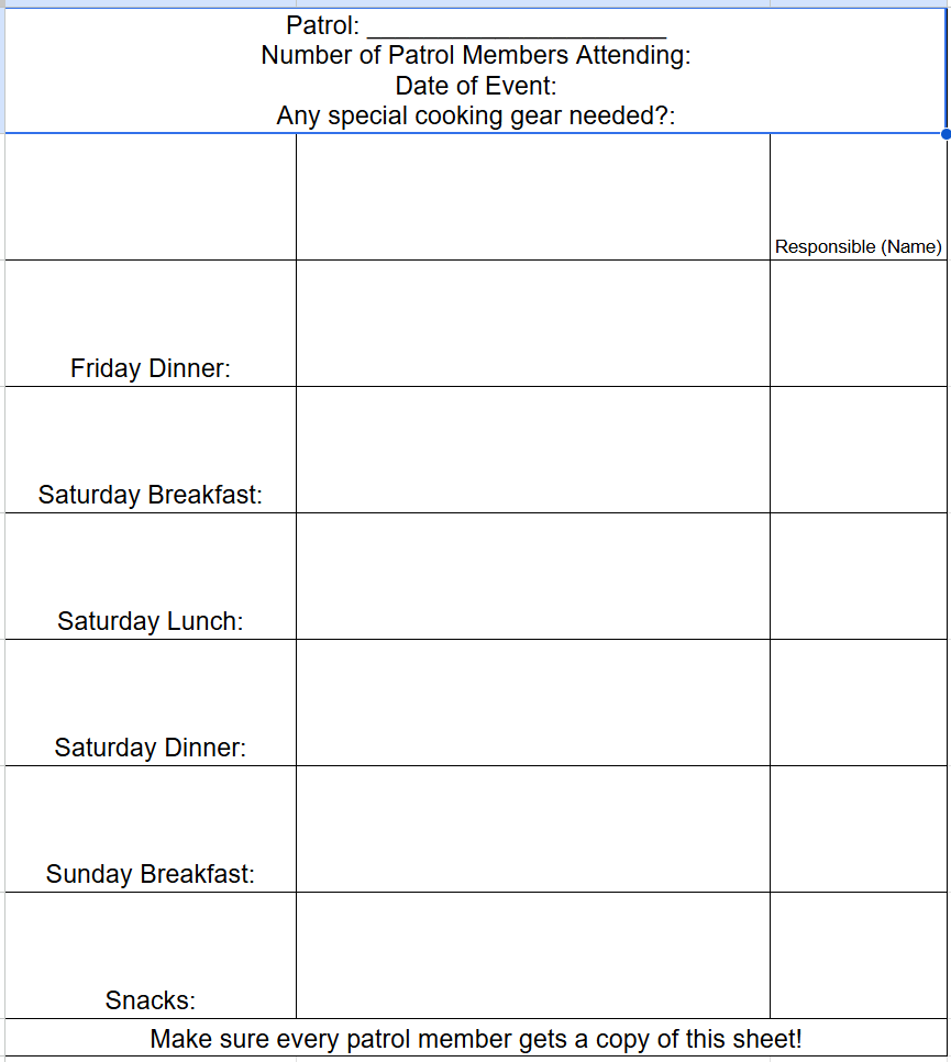 Here is the meal plan sheet we hand out to patrols for a 3 day, 2 night campout. We find that it is important to validate Navigators have recorded who will bring each item and hand out copies of the filled out sheet to everyone coming on the campout. Even then, it’s good to talk through it with them, so you can answer questions as they come in, mostly having to do with handwriting.